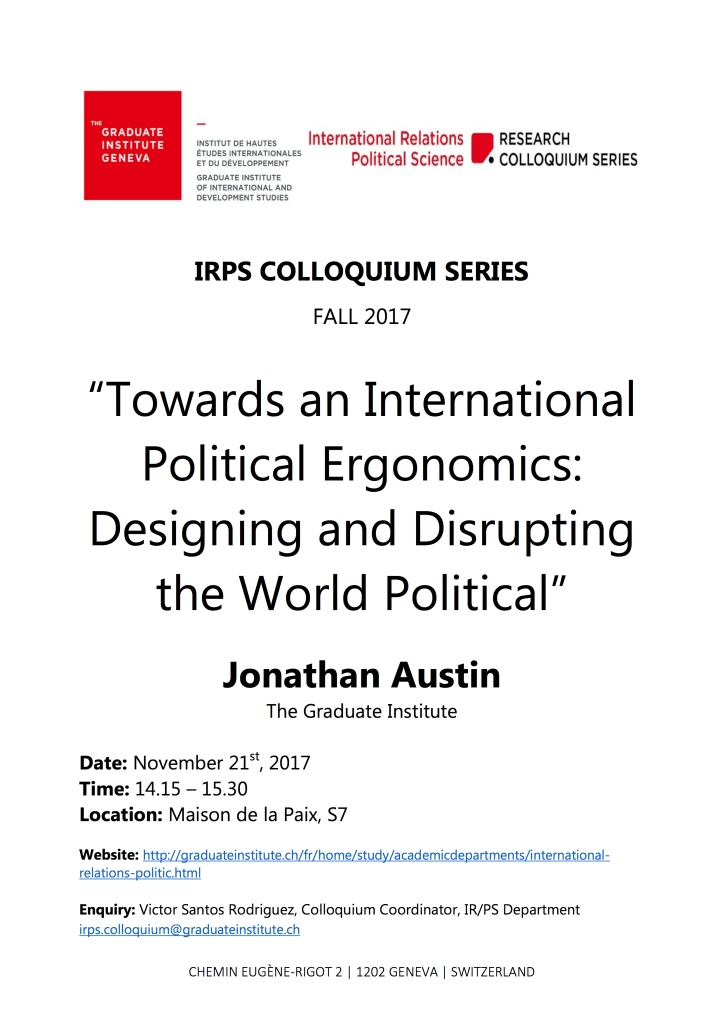 On 21st November 2017 I presented one of my latest research projects at the Graduate Institute of International and Development Studies as part of its International Relations and Political Science Seminar Series. At the seminar I presented a paper that theoretically grounds some of the work currently being developed at the Violence Prevention (VIPRE) Initiative (www.vipre.ch), which integrates theories of ergonomics into International Relations.
