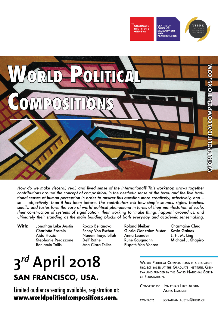 World Political Compositions begins in earnest with a workshop taking placed in San Francisco on the 3rd of April 2018, as a side-event of the 2018 International Studies Association meeting. The workshop brings together a leading and eclectic group of scholars who will explore their own use of the concept of composition.