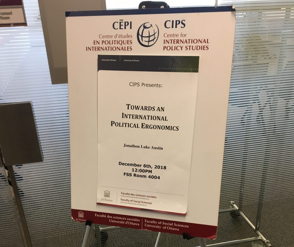 On Thursday 6th December I gave a talk at the University of Ottawa’s Centre for International Policy Studies entitled ‘Towards an International Political Ergonomics’ based on my current work exploring the interconnections between social theory, technology, and political change. A video version of the talk will be available shortly.