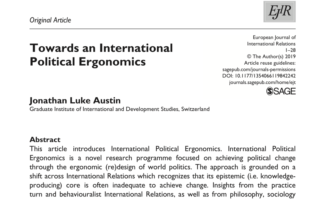 This article introduces International Political Ergonomics (iPER). iPER is a novel research programme focused on achieving political change through the ergonomic (re)design of world politics.