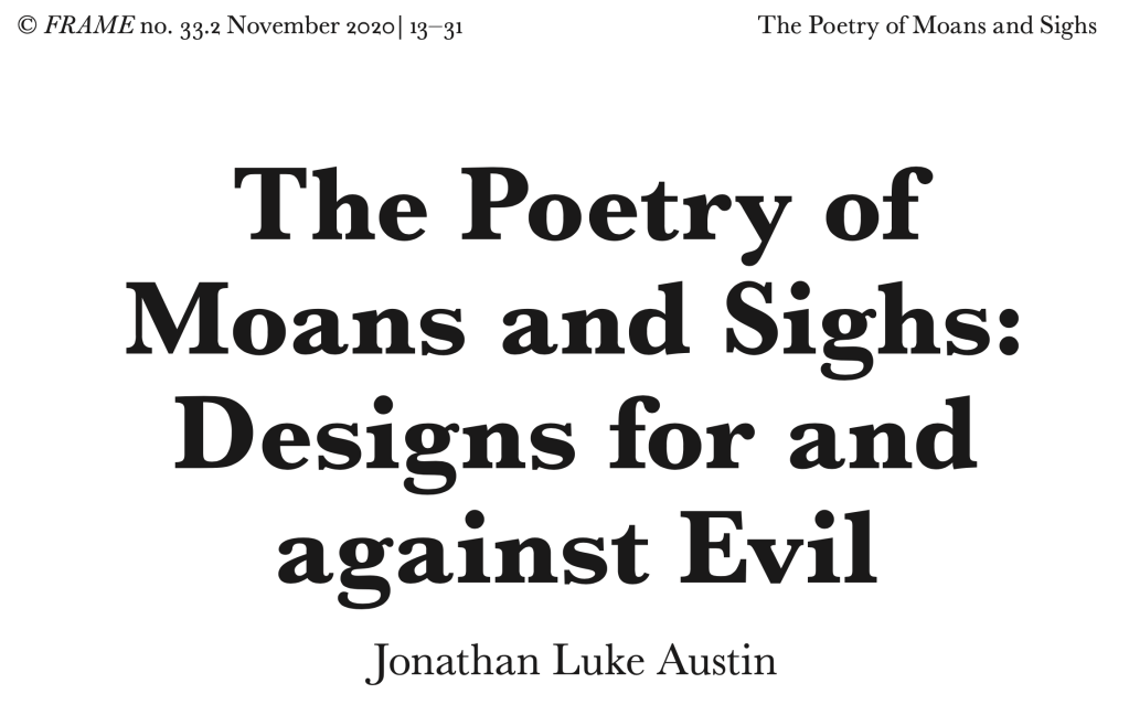 I have a new piece published in Frame: Journal of Literary Studies, which discusses how we can think about ‘designs for and against evil.’ The piece draws on the work of Iraqi novelist Ahmed Saadawi, alongside architectural theory and praxis, to describe the ‘poetry of moans and sighs’ that afflict world politics. It begins with the idea that we can think about war and violence in ‘a-subjective’ terms (i.e. without an intentionally acting human subject), but then moves to asking what – if that’s true – we can ever imagine doing about it? To approach an answer, I draw on the philosophy of Donna Haraway, as well as work from Hanna Arendt and Franz Kafka, to suggest the necessity of moving beyond the epistemic and reflexive and towards the performative, artistic, material, and designed.
