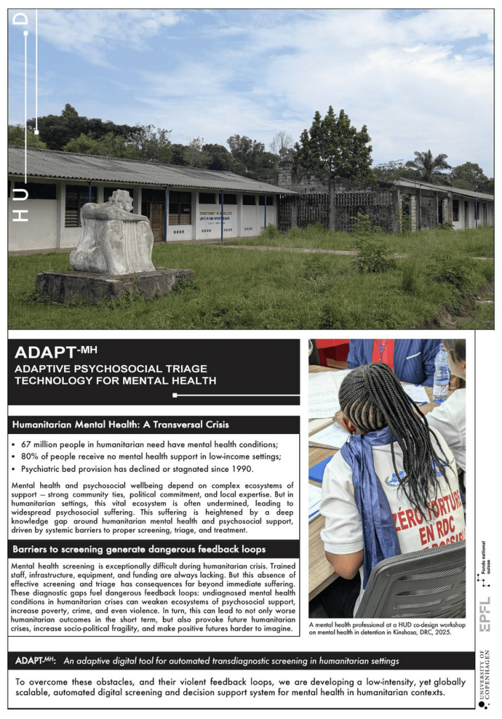 Over 65 million people in humanitarian need also suffer from a mental health condition, yet most are never diagnosed or treated due to extreme resource constraints. ADAPT-MH (Adaptive Psychosocial Triage Technology) addresses this gap. ADAPT-MH is a scalable digital system for automated psychosocial screening and triage in humanitarian contexts. It leverages machine learning to deliver clinical decision support, enabling task-sharing and stepped-care approaches to mental health services. Developed through key partnerships in the Democratic Republic of the Congo, Colombia, and South Africa, ADAPT-MH also draws on the expertise of humanitarian partners at the ICRC and Terre des hommes — all working toward one shared goal: reducing the global burden of mental health and psychosocial suffering. ADAPT-MH is a result of my work as Principal Investigator for the Future of Humanitarian Design (HUD) research project. As part of HUD, a bottom-up needs assessment was produced through a year-long ethnography of humanitarian settings, which resulted in a community-driven focus on mental health technology and its potential to improve primary care services.